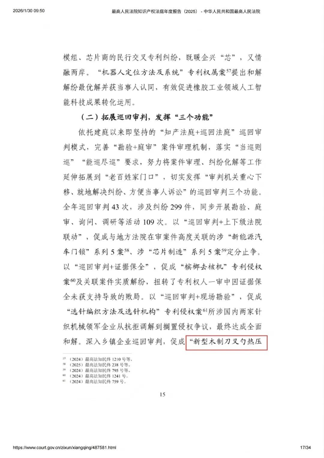 而在《报告》第二部分“做实定分止争,以实质解纷促进融合发展”中,三聚阳光代理的涉“一种新型木制刀叉勺热压成型机”侵权纠纷案【(2025)最高法知民终385号】被作为“巡回审判”的典范提及。